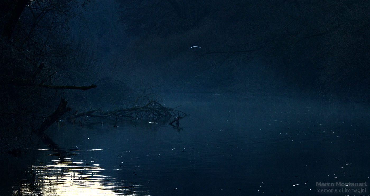 un airone bianco sorvola l'acqua del fiume all'imbrunire