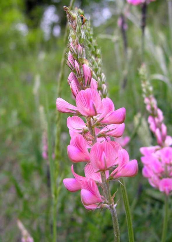 Onobrychis viciifolia Scop. Fieno santo, Lupinella Le foglie sono imparipennate (13-25 segmenti), le inferiori ellittico lineari, le superiori più strette. I fiori, riuniti in infiorescenze apicali hanno calice avvolgente composto da 5 sepali, corolla di colore rosa intenso con venature porpora, il vessillo ripiegato verso l'alto e carena lunga quanto il vessillo formata da due petali fusi tra loro. Altezza 20-80 cm. Cresce in terreni asciutti. E’ una pianta coltivata come foraggera, ma è sfuggita frequentemente alle coltivazioni, quindi non è insolito trovarla allo stato spontaneo. I nomi comuni indicano il primo, che è considerata ottimo foraggio, il secondo che i fiori, anche se più piccoli, somigliano a quelli dei lupini. Simile a è Onobrychis viciifolia Scop., ma di dimesnioni inferiori, foglie con 11-15 segmenti fogliari e corolla con vessillo più breve della carena. Presente nei pascoli aridi montani dell'Italia settentrionale e centrale. -