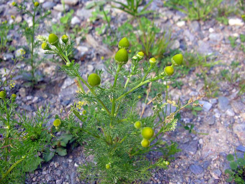 Matricaria discoidea DC. Camomilla falsa Pianta annuale con fusti eretti, molto ramificati e densamente fogliati, radice fibrosa, altezza fino a 30 cm. Tutta la pianta emana un odore simile a quello della camomilla, ma più persistente. Le foglie alterne e sessili divise in lacinie sottili. I fiori, di colore verde-giallastro, formano capolini solitari con peduncoli rigonfii all’apice e involucri emisferici sono privi di fiori ligulati. Pianta dei terreni incolti e delle macerie da 400 a 1.500 m slm. Pianta antispasmodica, carminativa lievemente sedativa, vermifuga. Il nome del genere deriva dal latino: indica che in passato quest’erba veniva impiegata dopo il parto, si riteneva fosse utile nel trattare le infezioni dell'utero. Il nome specifico indica la forma a discoidea del capolino. -